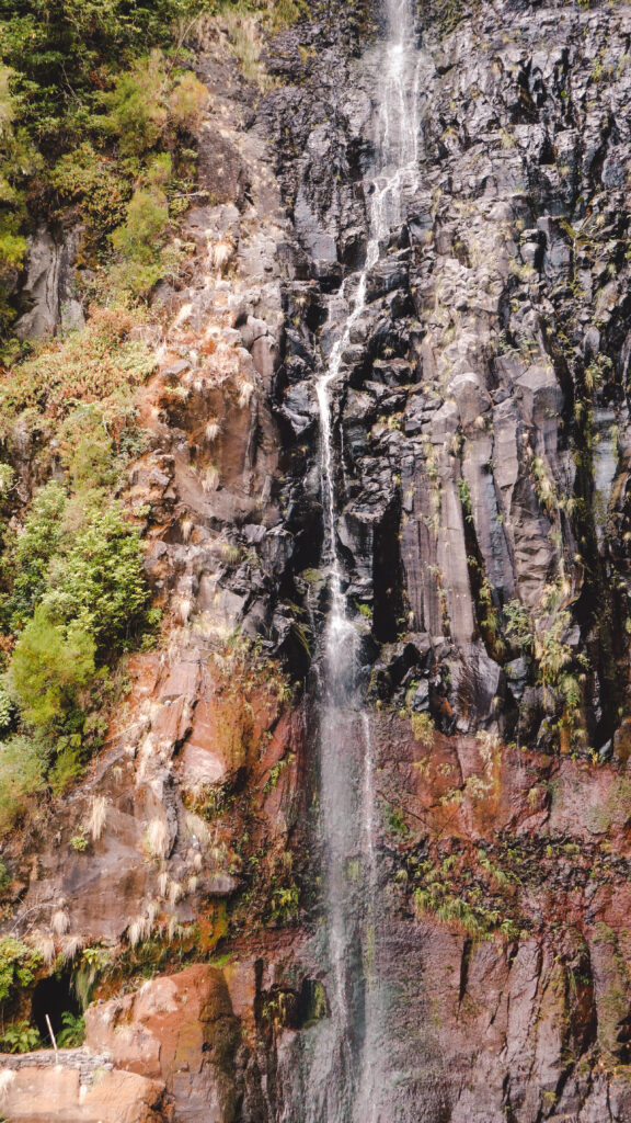 In het midden van het eiland ligt de Risco waterval verstopt. Met de auto rijden we naar een parkeerplaats dichtbij de start van deze route. (Navigeer naar: Levada do Alecrim Parkplatz) Nadat de auto is geparkeerd moet je nog een stukje naar beneden lopen en daar staat een huisje. Hier vertrekt om de 10 tot 20 minuten een busje naar het begin van de wandelroute. Je kunt er ook voor kiezen om dit stuk te gaan lopen. Een retourtje kost 5 euro en een enkeltje kost 3 euro. Wanneer het busje ons afzet staat de wandelroute naar de Risco waterval duidelijk aangegeven. De route is makkelijk te bewandelen (1 km en vlak) en voor alle leeftijden te doen. Je kunt de route naar de waterval ook combineren met de route naar de 25 Fontes. Dit wandelpad is wat uitdagender: smallere wegen en meer hoogteverschil. De route naar de 25 Fontes is ongeveer 2 km.